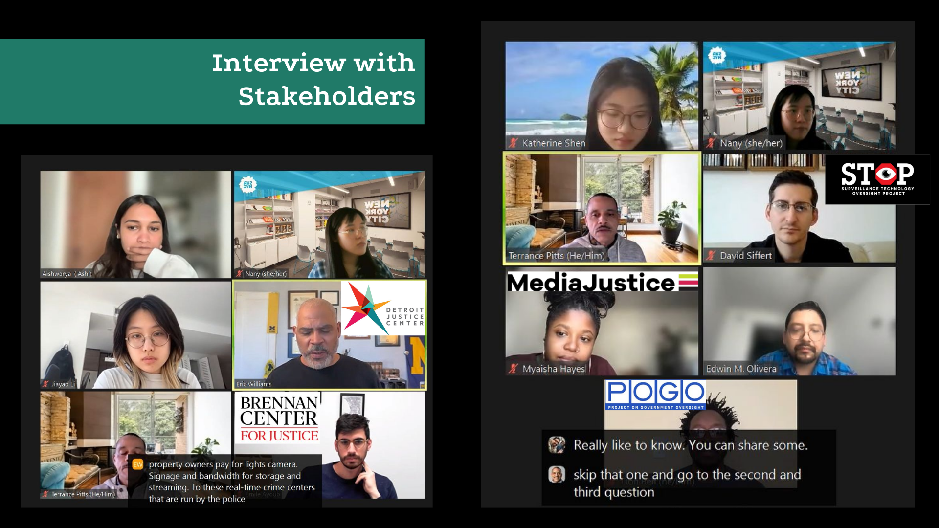 Conducted 2 semi-structured interviews with 6 key stakeholders specializing in Artificial Intelligence, Social Justice, National Security, and Technology Surveillance.