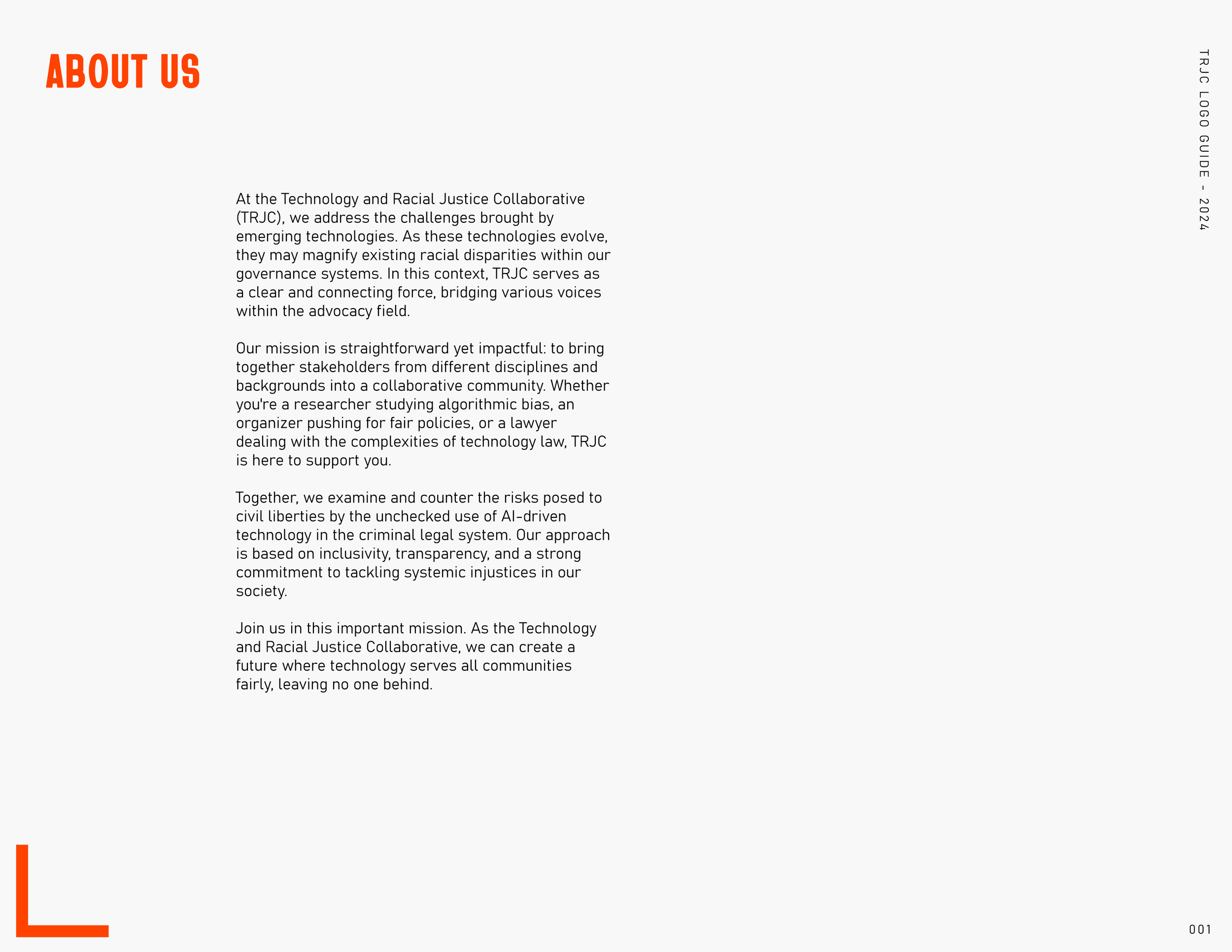 This branding project, in collaboration with Terrance Pitts, Senior Research and Advocacy Fellow at NYU School of Law, developed a cohesive brand identity, including a logo and newsletter design, to support an online community addressing racial justice issues caused by AI. The logo symbolizes justice and equity, while the visually engaging newsletter template informs and connects community members. These elements strengthen TRJC's presence, foster stakeholder engagement, and enhance information sharing."