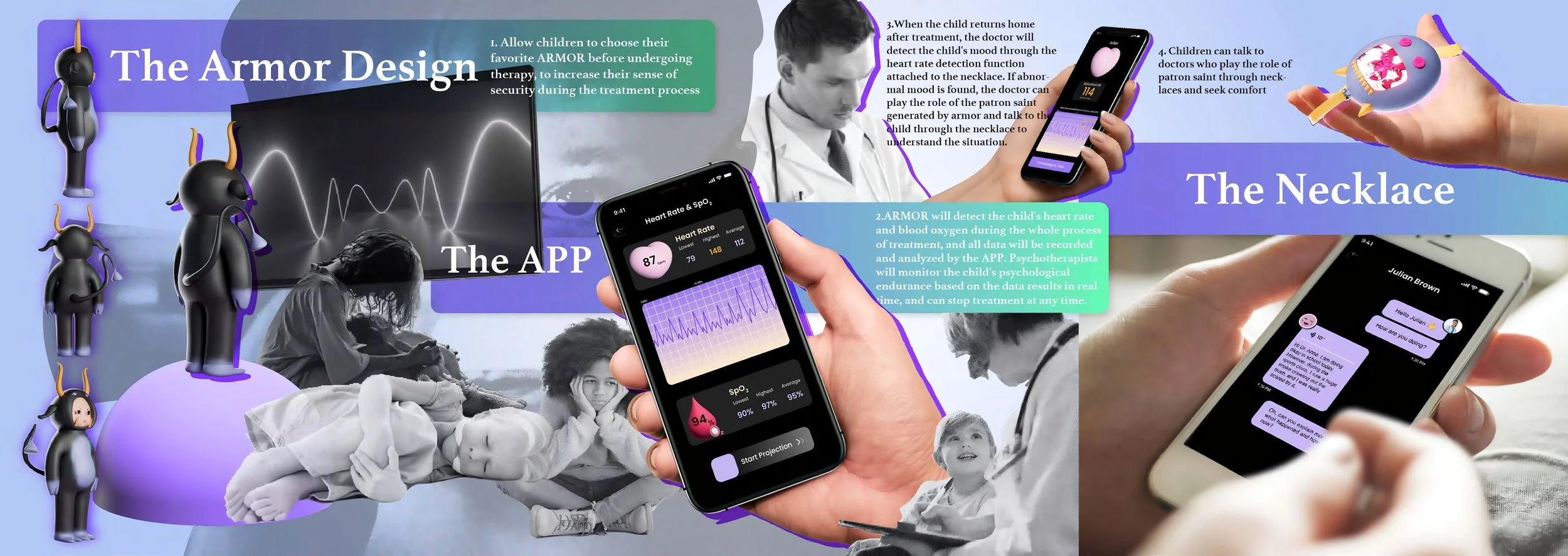 During my undergraduate studies in psychology, I learned in a clinical psychology class that one core process in PTSD treatment—exposure therapy—can be extremely overwhelming, especially for children. This insight deeply moved me and led to the initiation of this project. Drawing from what I learned about the placebo effect, I explored how belief, emotional projection, and design could come together to support recovery. By designing a therapeutic app paired with a “protective armor,” the goal is to help children feel braver, safer, and more willing to participate in trauma treatment.